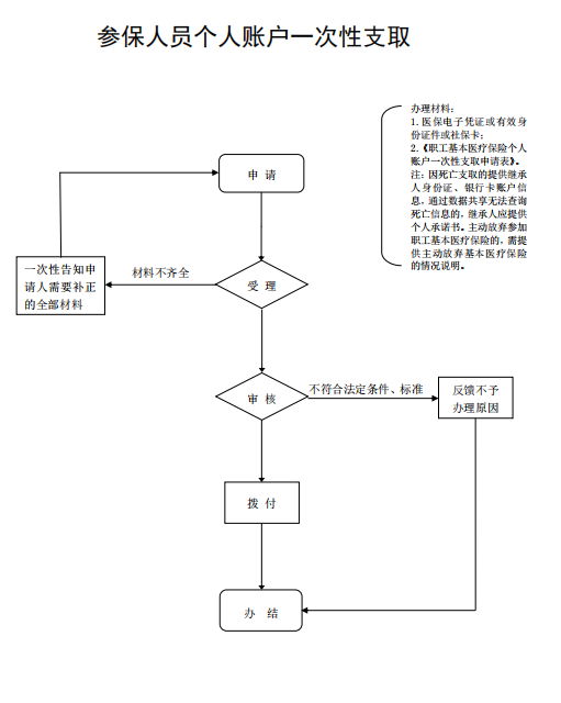 1、医保电子凭证或有效身份证件或社保卡;2、《职工基本医疗保险个人账户一次性支取申请表》(加盖公章);